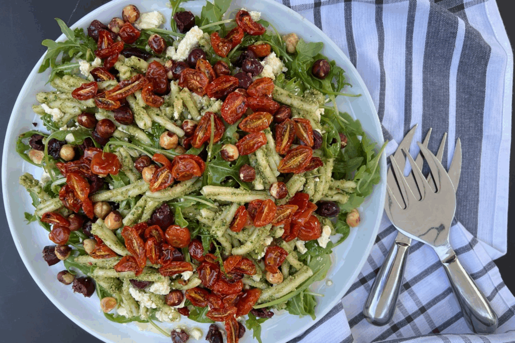 This vibrant contemporary pasta salad features a flavourful parsley-hazelnut dressing, complemented by crunchy whole roasted hazelnuts. Roasted cherry tomatoes add a burst of sweetness, while briny olives and creamy feta cheese provide a savory contrast. This forms a tasty base for many protein options.