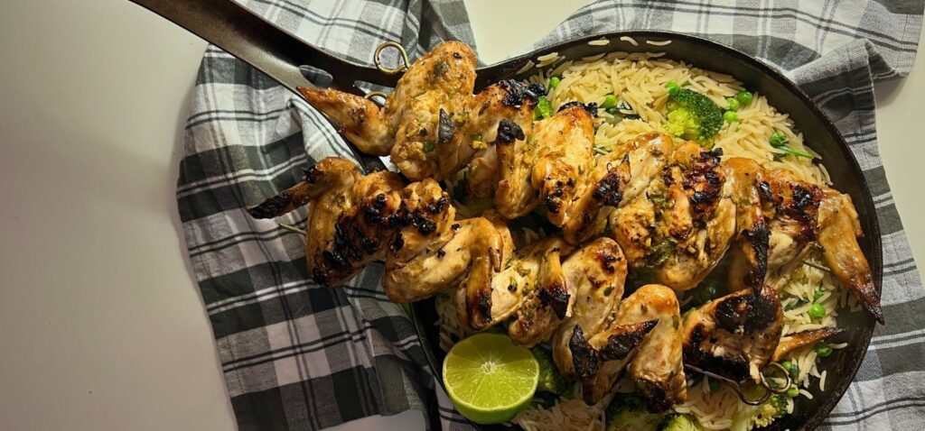 Finger-licking chargrilled chicken wings – Threading these deluxe tasting chicken wings on double metal skewers means they are so much easier to cook apposed to if they are individually thrown on the BBQ! These would also look fabulous piled on a big platter at a party, make sure there are finger bowls available plus a place for the bones to be disposed of. Here I served them for dinner with rice and green vegetables.