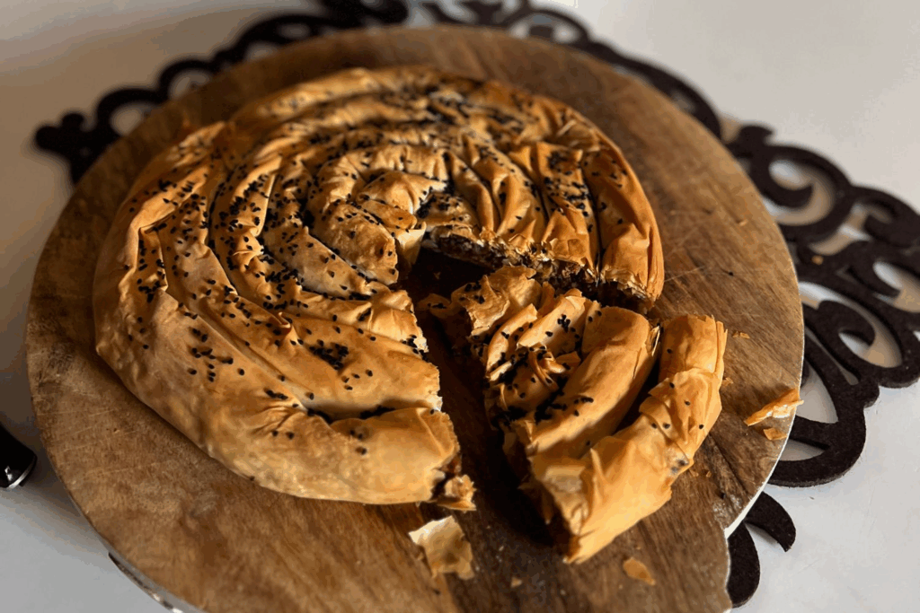 - Using 2 sheets of filo at a time, place one on bench, long side towards you, brush lightly with olive oil. Place the second sheet on top and brush again. Place about ⅓cup of lamb filling along one long side of the filo and roll into a sausage shape. Shape into a coil on prepared baking tray. Repeat the process until all filling is used and a large ‘pie’ has been formed. Brush filo with a little oil and scatter with seeds.