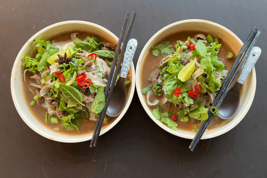 This is a flavourful and aromatic dish that combines tender slices of beef with fresh herbs and zesty lemongrass. Served with rice noodles, greens and a beefy broth, it’s the perfect balance of savory, sweet, and tangy. Whether you’re craving something light and refreshing or packed with bold flavours, this noodle bowl will transport your taste buds straight to Southeast Asia.