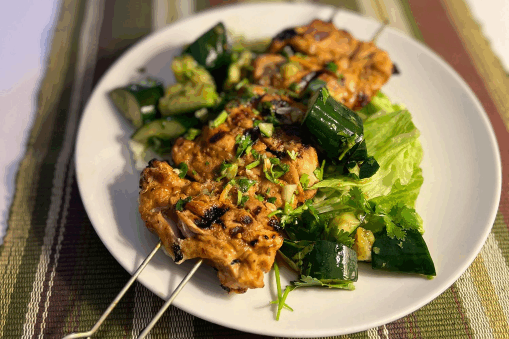 PEANUT CHICKEN SKEWERS, SMASHED CUCUMBER SALAD