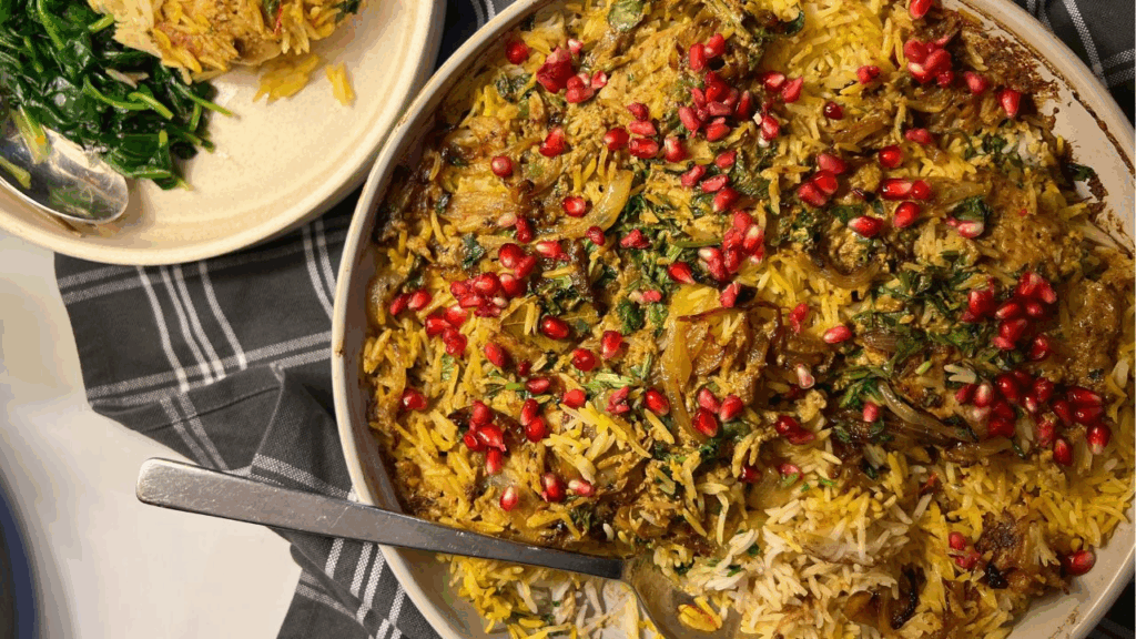 - Drizzle half saffron liquid onto rice, spoon over half yoghurt ’gravy’ and top with half amount caramelised onion, finally scatter over a third of the chopped herbs. Repeat layering with remaining components. Arrange chicken thighs on top of rice, and press them down so the golden skin is just showing. Cover dish and bake for 20 minutes to finish cooking rice and chicken.